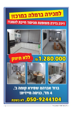 למכירה ברמלה במרכז! דירה נדירה משופצת מהיסוד חייבת להמכר! ₪1.280.000ללא תיווק ברח‘ אברהם שפירא קומה ב‘, 4חד‘ ,כניסה מיידית! ,050-9244104לא בשבת * (+%)%)')'