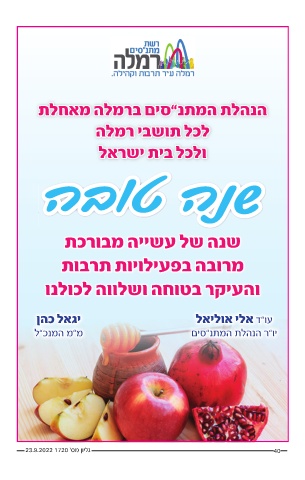 הנהלת המתנ“סים ברמלה מאחלת לכל תושבי רמלה ולכלביתישראלשנה טובה שנה של עשייה מבורכת מרובה בפעילויות תרבות והעיקר בטוחה ושלווה לכולנו יגאל כהן עו“ד אלי אוליאל מ“מ המנכ“ל יו“ר הנהלת המתנ“סים )*%0%)'))