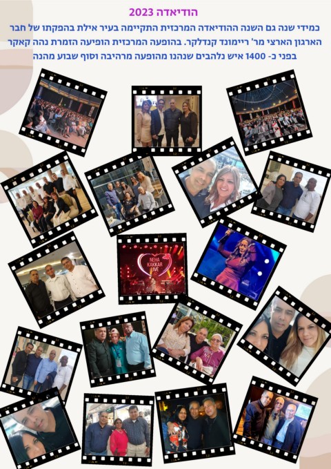הודיאדה 2023 כמידי שנה גם השנה ההודיאדה המרכזית התקיימה בעיר אילת בהפקתו של חבר הארגון הארצי מר' ריימונד קנדלקר .בהופעה המרכזית הופיעה הזמרת נהה קאקר בפני כ 1400 -איש נלהבים שנהנו מהופעה מרהיבה וסוף שבוע מהנה